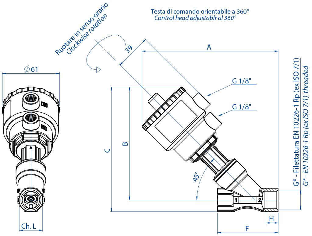 Threaded valve ends, as per EN 10226-1 Rp (ex ISO 7/1) for Ares valves; ISO 228/1 for Zeus valves. Other types available on request.