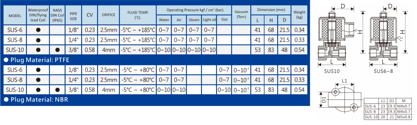 .SUS series is direct-acting, conductive, and normally closed (NC) 2/2 way